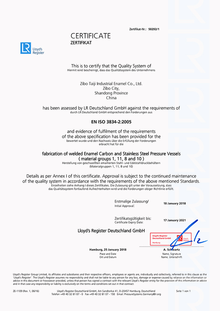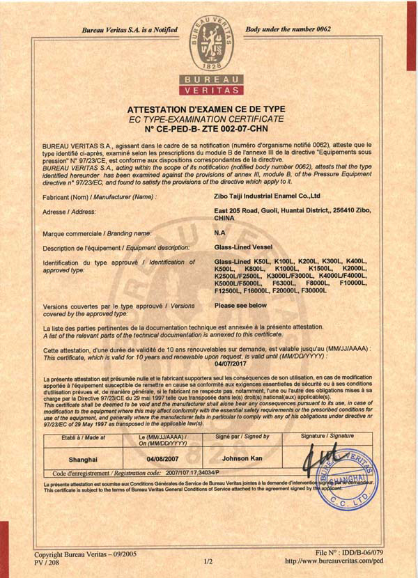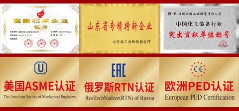 淄博太極在中國(guó)搪玻璃設(shè)備制造行業(yè)中首家通過ISO90001質(zhì)量體系認(rèn)證,并擁有美國(guó)ASME認(rèn)證、歐洲PED認(rèn)證以及國(guó)家部門頒發(fā)的搪玻璃制造許可證、進(jìn)出口許可證和百余項(xiàng)榮譽(yù)證以及三十六項(xiàng)專利等。